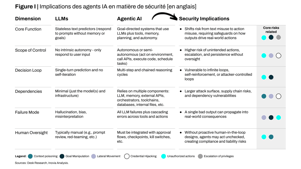 Les agents sont probabilistes et non déterministes, ce qui signifie qu’au lieu de toujours renvoyer le même résultat, leur objectif est d’interpréter des objectifs, de planifier des actions en plusieurs étapes et d’ appeler des outils ou des API, ce qui conduit à des comportements variés. Cette autonomie, si elle est adoptée à grande échelle, amplifie les risques : un agent exploité ne se contente pas de divulguer des données, il peut se déplacer d’un système à l’autre, prendre des mesures et provoquer des défaillances en cascade.