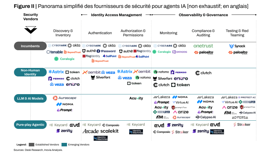 Alors que les entreprises adoptent rapidement les agents IA, un écosystème de fournisseurs de sécurité a commencé à se former. Conscientes de l’ampleur de cette opportunité, de nombreuses entreprises prennent déjà des mesures audacieuses pour conquérir rapidement des parts de marché. Nous avons regroupé ces acteurs en quatre catégories, qui sont représentées dans la figure II.
