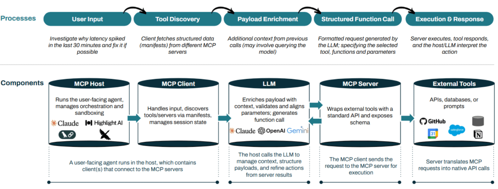 Au‑delà des API, les agents ont besoin d’autres éléments qui apportent structure et fiabilité. Les manifestes MCP fournissent des métadonnées utiles au raisonnement; les couches d’orchestration coordonnent des flux multi‑étapes; la gestion du contexte suit l’état d’une étape à l’autre; l’observabilité relie journaux et exécution; et les systèmes d’identité appliquent des accès restreints. Ensemble, ces éléments font passer le modèle de « l’appel de fonctions à l’aveugle » au raisonnement avec des outils intégrés dans un système.