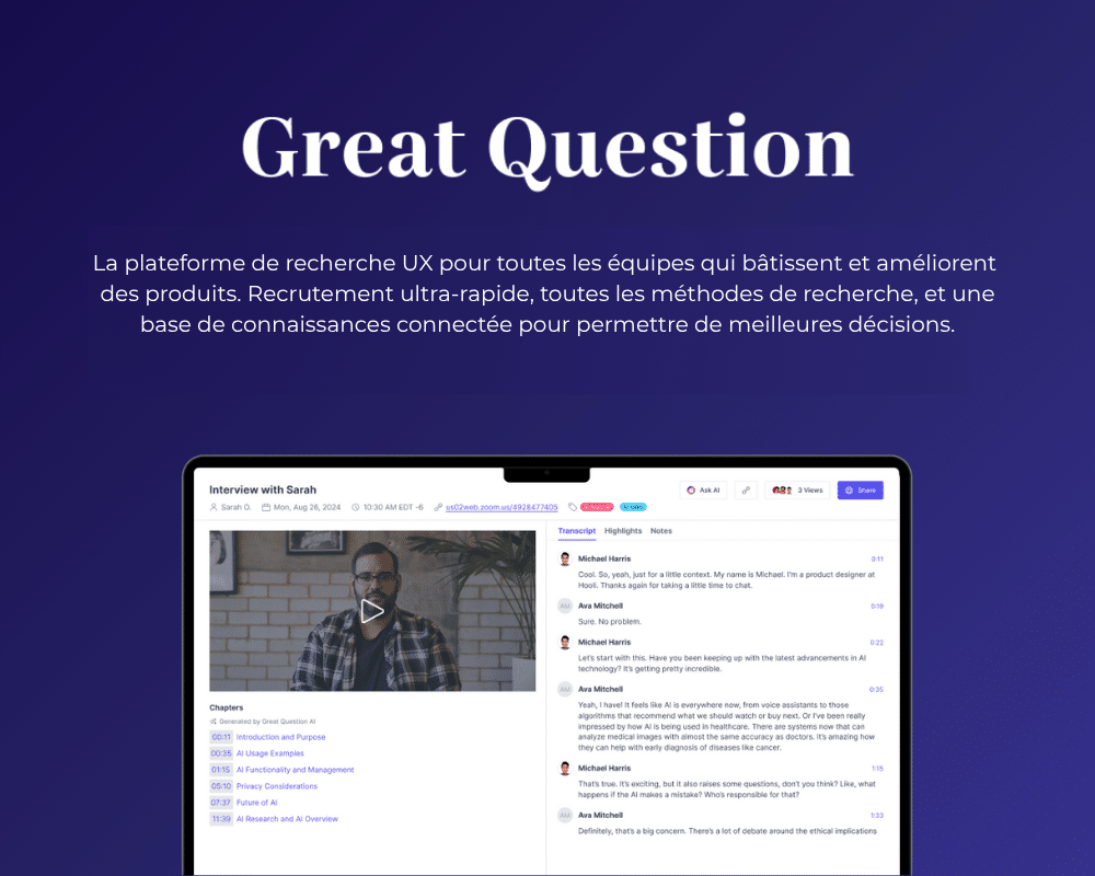 Great Question transforme la manière dont les entreprises communiquent avec leurs clients. La plateforme unifie l’ensemble du processus de recherche (du recrutement et de la planification aux entretiens, à l’analyse et au partage) dans un espace de travail alimenté par l’IA et conçu pour les chercheurs, les concepteurs et les équipes produit.